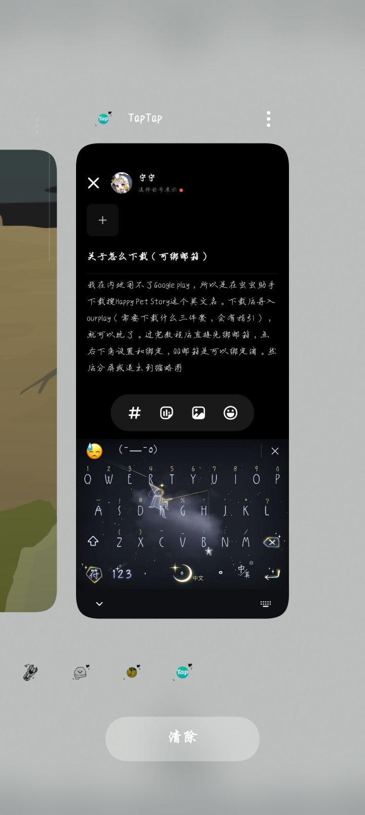 我在内地用不了Google play,所以是在虫虫助手(一个软件,试试应用商店有没有如果没有就在夸克搜)搜Happy Pet Story这个英文名然后下载。下载后导入ourplay(需要下载什么三件套,会有指引),就可以玩了。过完教程后直接先绑邮箱,点右下角设置和绑定,QQ邮箱是可以绑定滴。然后分屏或退出到缩略图状态(p2),打开QQ邮箱,再点链接进游戏就绑定成功了。⚠️不要直接往上滑跳到邮箱点