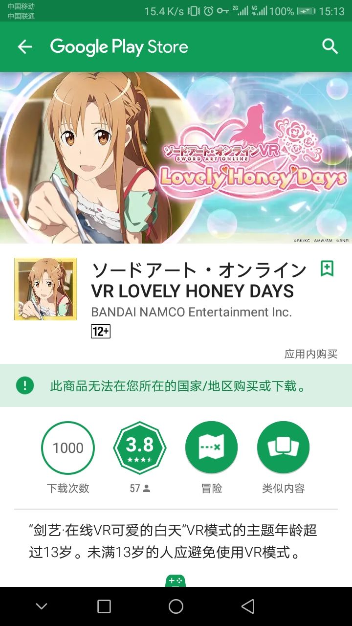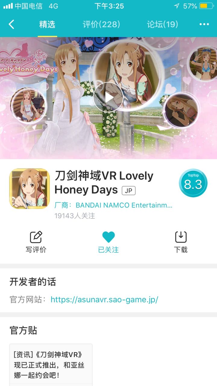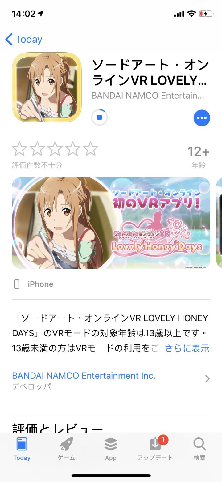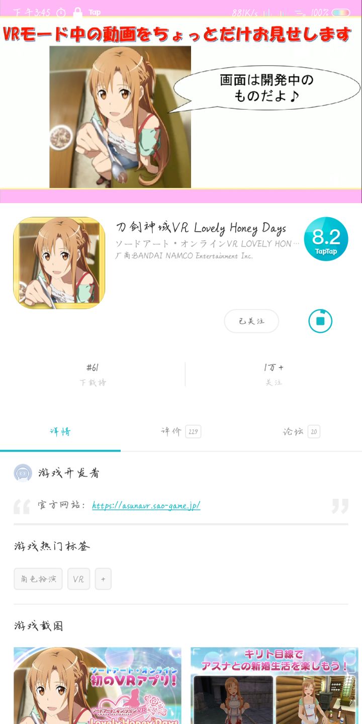 由 BANDAI NAMCO Entertainment 推出的以动漫作品《刀剑神域》中角色亚丝娜为主题的 VR 手机游戏 《刀剑神域VR Lovely Honey Days》目前已正式上线。玩家可以免费下载体验第一章,并通过付费解锁第二章至第七章的内容。在游戏中,玩家将化身主角桐人,与亚丝娜进行通过社交 App 进行对话,并相约至 VR 游戏中进行约会。当玩家戴上VR眼镜后,即可身临其境地体验