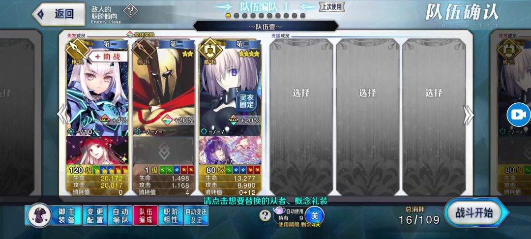 简单概括:总共耗费1灵脉石,等于耗费三划令咒,只需要1级的列奥尼达王,80级玛修,路人那里借个120妖兰即可。 思路:这一关的队员牺牲对面就大回血的负面效果让这一关要么瞬杀,要么不死队员的情况下消耗,很困难,查阅了很多攻略,有C呆贞德梅林消耗的,还有玉藻前单刷的,在C呆遍地走的时代,玉藻前助战单找不好找,那个攻略还翻车过,也就是说玉藻前消耗没那么稳。 最后我找到了一个活动攻略参考了一下,那个活动b