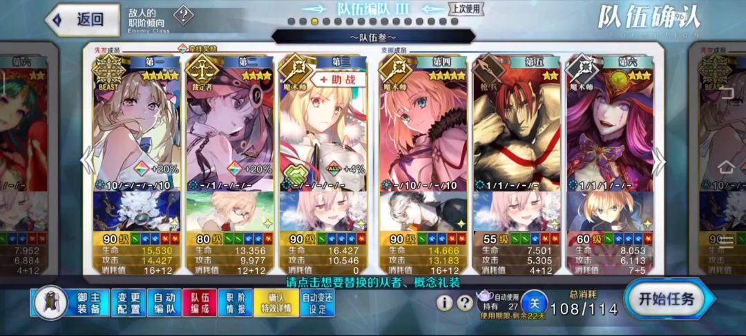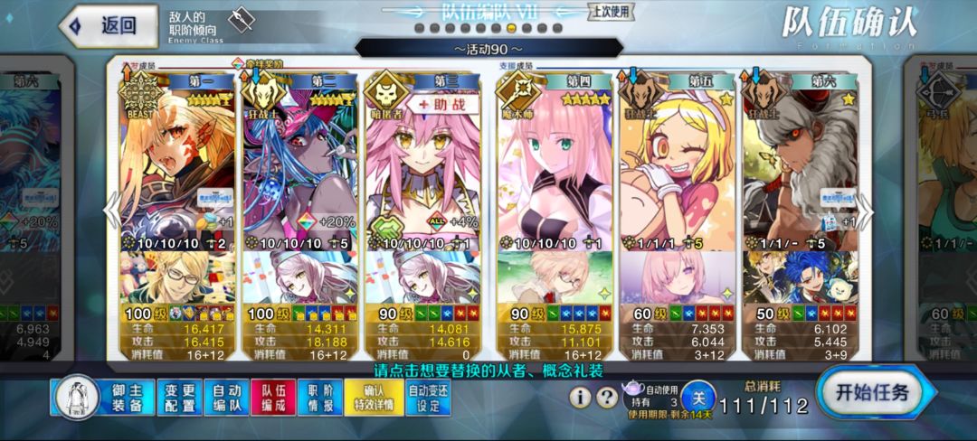 昨天打完活动剧情,不过没有专门刷90++,随便组的阵容慢慢磨过去的,今天才调完要刷90++的阵容 剧情号就不说了,因为剧情号没啥好用的角色真的组阵容都头疼,最后是用的五加成打的,没啥意思 这次主要水一下初始那个号90++贪羁绊阵容(贪的不多,只能勉强贪一点,,,) 就是这一套,兽科无脑贪阵容,因为杀狐带NFF的比较好找,所以只能牺牲一些羁绊了,,, 理想情况下应该是上面这样的,不过c呆助战NFF比