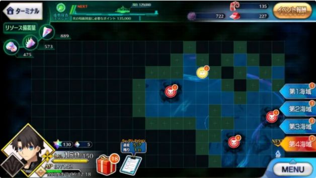 活动机制为点数制,每探索一个格子会获得一定的探索点数,攒够了一定的探索值才会开启下个地图,并且如图所示只能从明暗交界处选择地点进行探索 不同的从者探索形状也不一样 然后比较坑的一点是点数奖励要拿全我记的得把图全点亮才行。 然后每个海域有很多大怪,每个怪有不同的buff,需要相应的从者来解掉。从者跟随活动进度逐步加入,所以有些怪前期打不了或不好打要先绕开,如果有对应的从者在进图时会有相应的助战