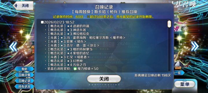 这两天运气超好的,小太阳四阶,黑枪呆5阶。总共就耗了300多个石头。斯卡哈。一发10连直接出