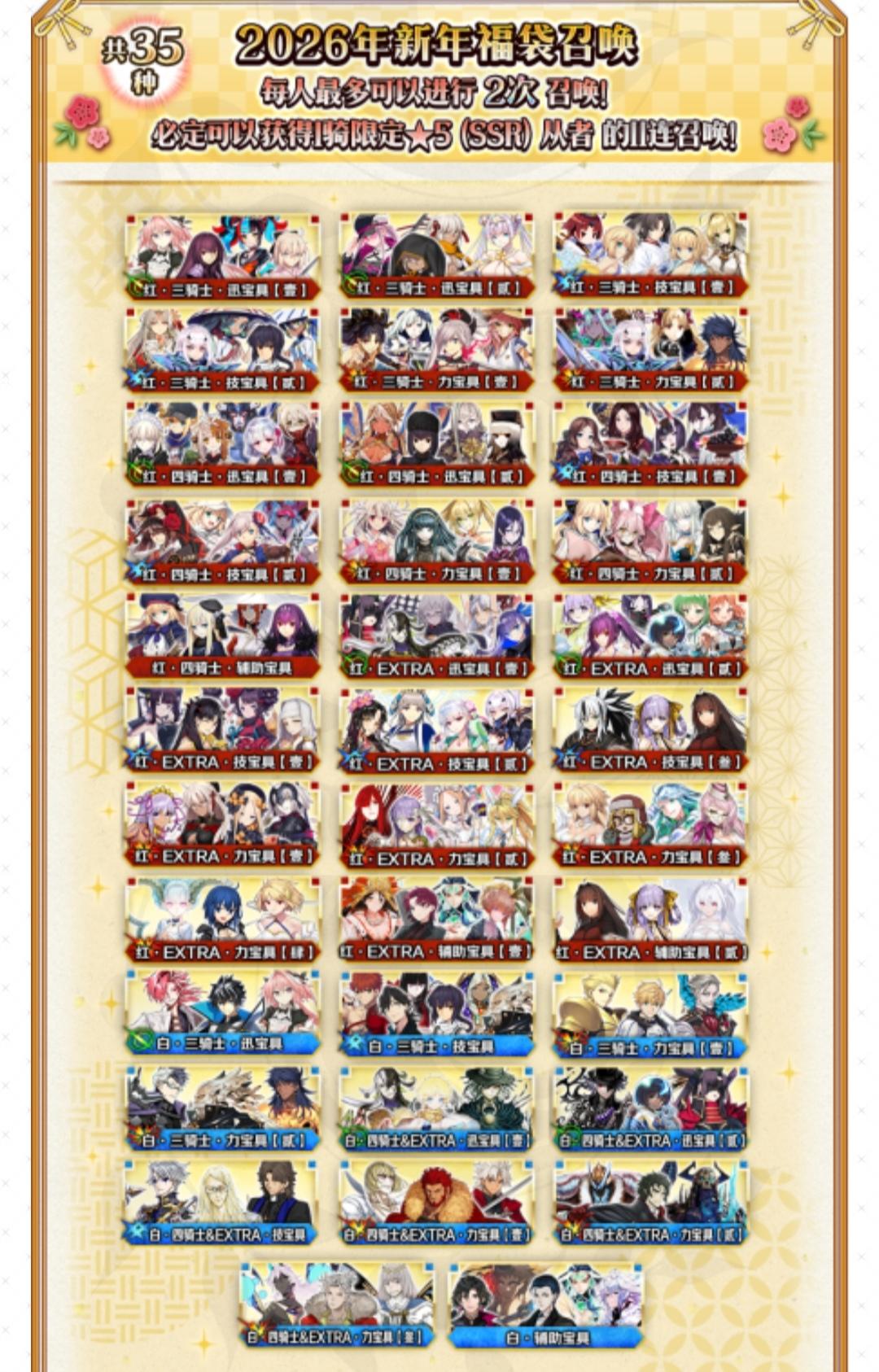 明年所有从者都复刻三遍以上,也有几个强度优秀的新从者(但多数没必要抽取)这里强度说明一下,考虑冠位战,如果没有强迫症非氪佬不建议任何从者五宝,三宝完全体,四宝就是满配(拐一宝即可)S:c呆,优先保证基本的刷本与高难能力,双c呆凭借常驻巡灵商店内的各种四星基本满足冲浪90甚至90+,萌新的首选(当然如果是红卡起号优先级略降,但还是在补齐第一套阵容后优先保证有一只)所长,目前素质最高的打手,明年
