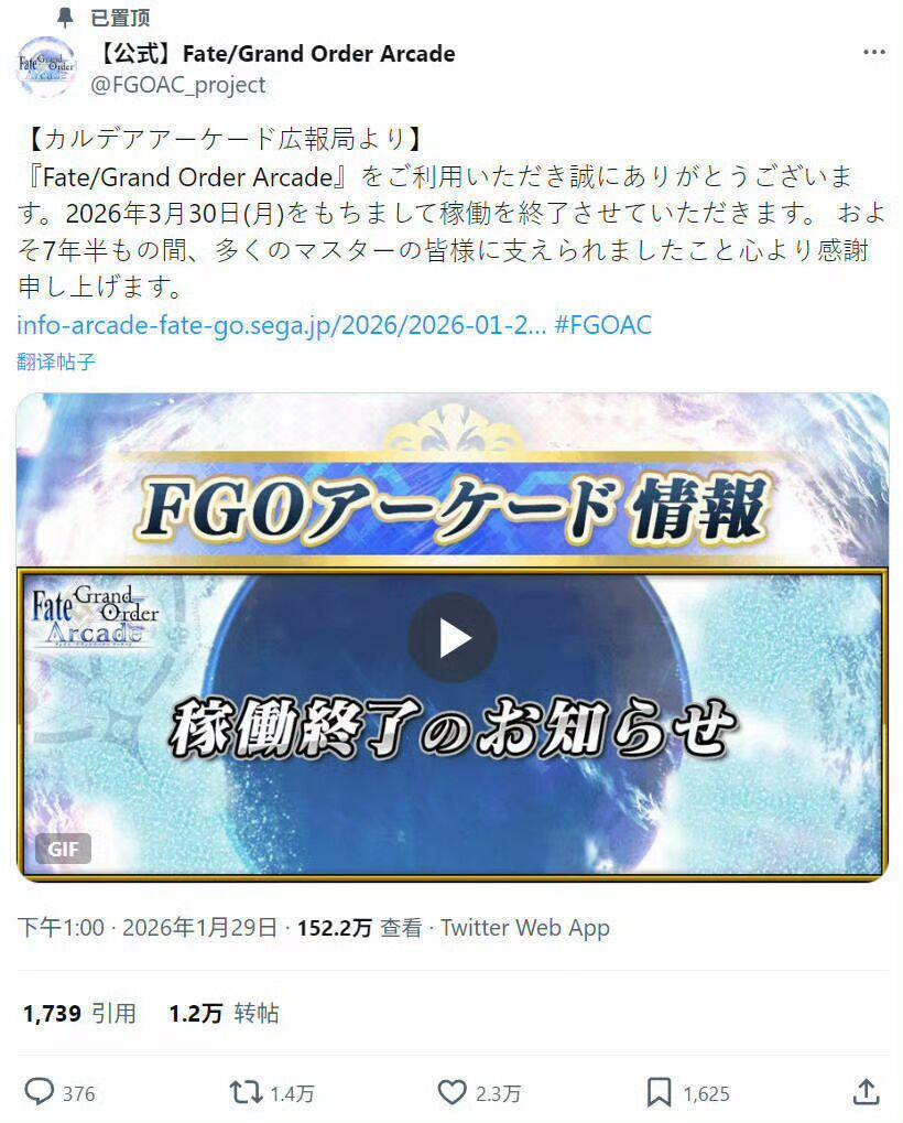 【快讯】Fate街机宣布3月30日停止运营