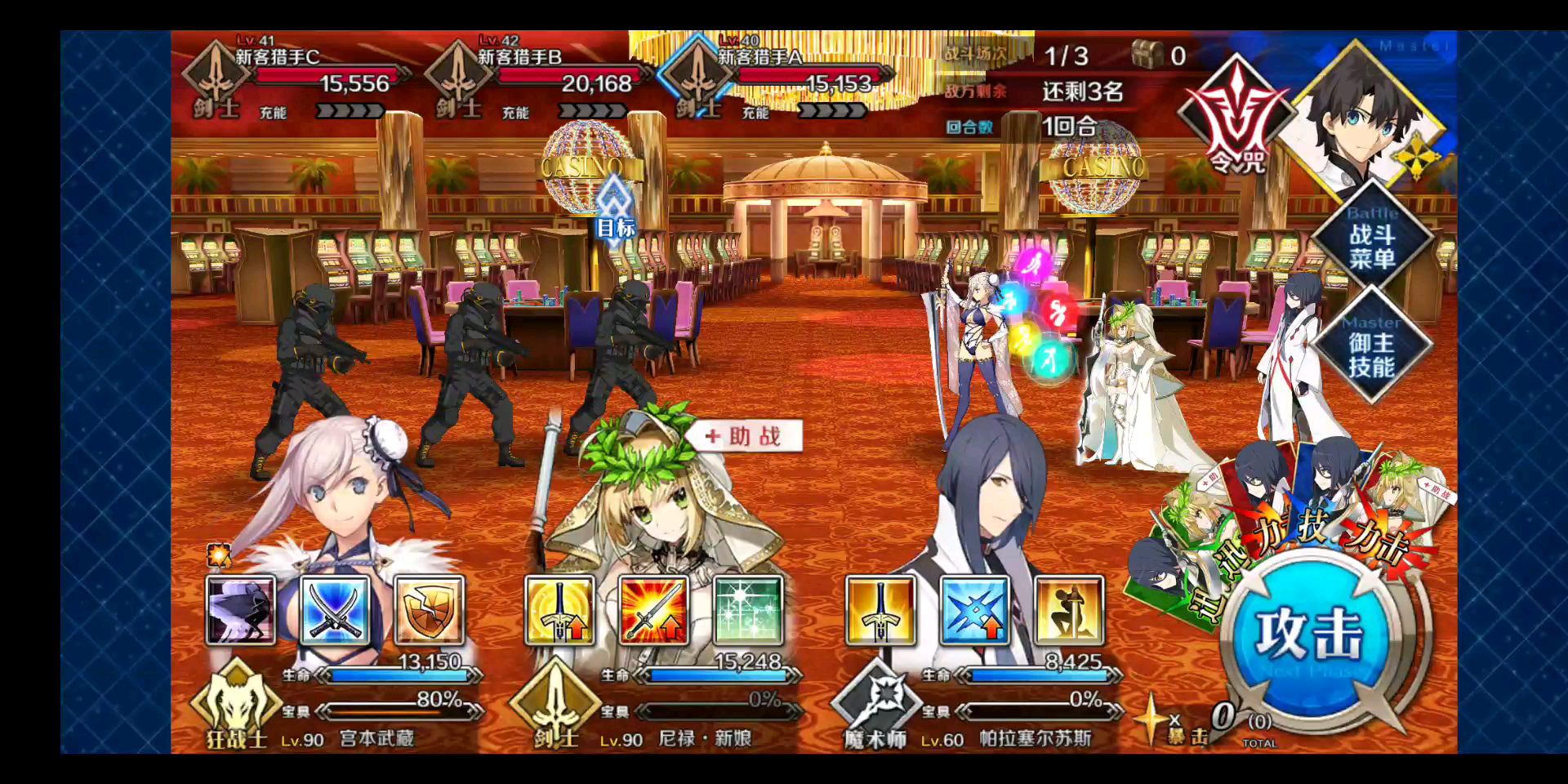 武藏技能1,7,7豆爸技能1,810.狐狸10,2,10.第2面要用换人服加攻,否则只np回收只有96。