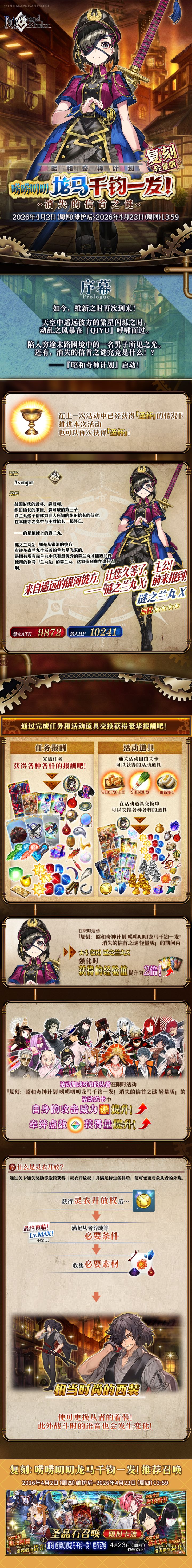 为各位亲爱的御主奉上「复刻:昭和奇神计划 唠唠叨叨龙马千钧一发!消失的信首之谜 轻量版」活动前瞻!陷入穷途末路困境中的一名男子所见之光。还有,消失的信首之谜究竟是什么?! ——「昭和奇神计划」启动!今后也请继续支持《命运-冠位指定》!