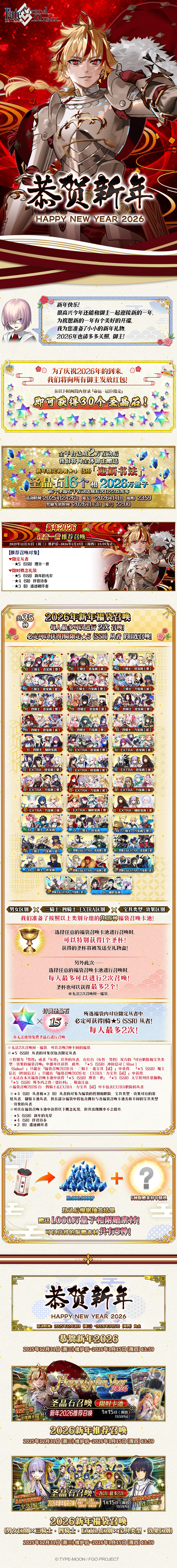 为亲爱的御主奉上新年活动前瞻!为迎接即将到来的2026年,新年红包登录奖励、福袋召唤、全新从者登场等活动将在游戏内开展!在相应活动时间内登录游戏,即可获得30个圣晶石的奖励哦!