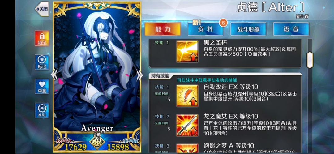 满级黑杯,红卡纹章一张是20爆伤,一张是25爆伤,指令卡强化2张红卡满了,2000金芙芙满了,除了等级,基本能强化都满了。一级换人服技能还能升几级,伤害还能高一点,其他猴戏懒得搞,保鲜又不会,伤害就这样了,你们想抽黑贞的可以参考一下