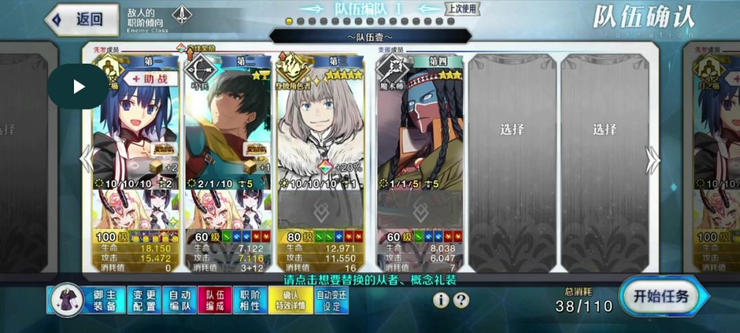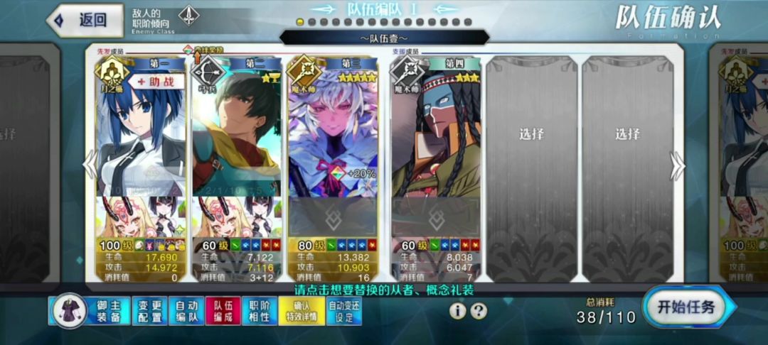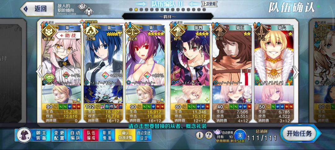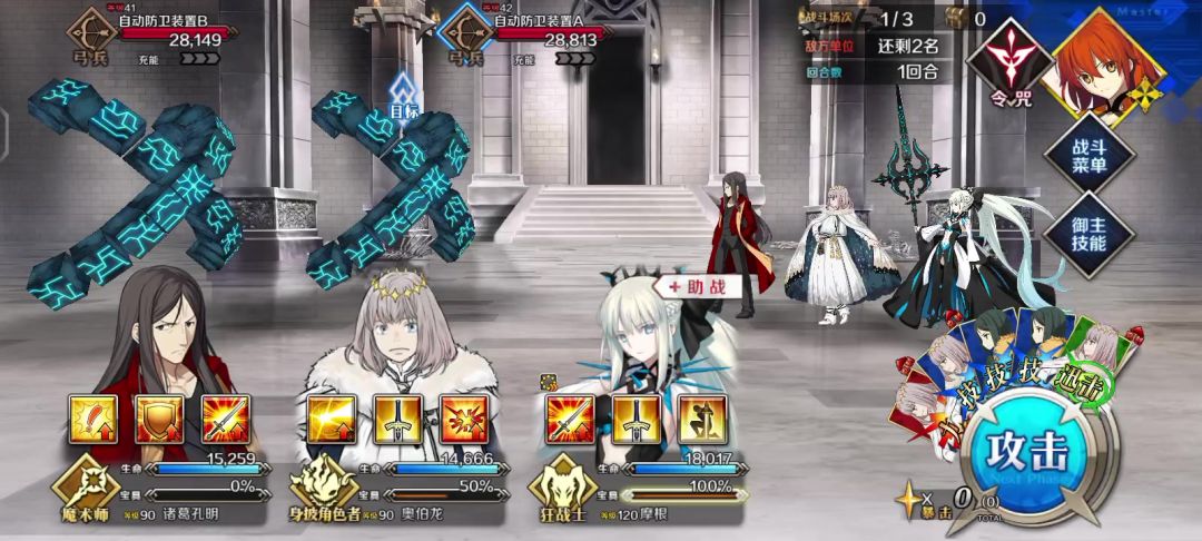 虽然汇呆是此次90++高光从者,但考虑到先前值班了很久的白纸化以及明年还要值班冠位狂,所以这里就用兽尼禄把她优化了。虽然要换人,但换的是活动50羁绊加成阿比,也不亏。第二面如果宝具最低随机数是要平a几下的,所以要先换阿比上来再开娄希的群体魔放,这样后面两下不管出那两张卡,在都是最低0.9乱数的情况下也是百分百过伤害线。