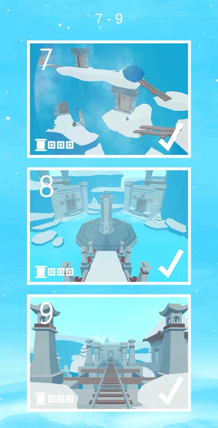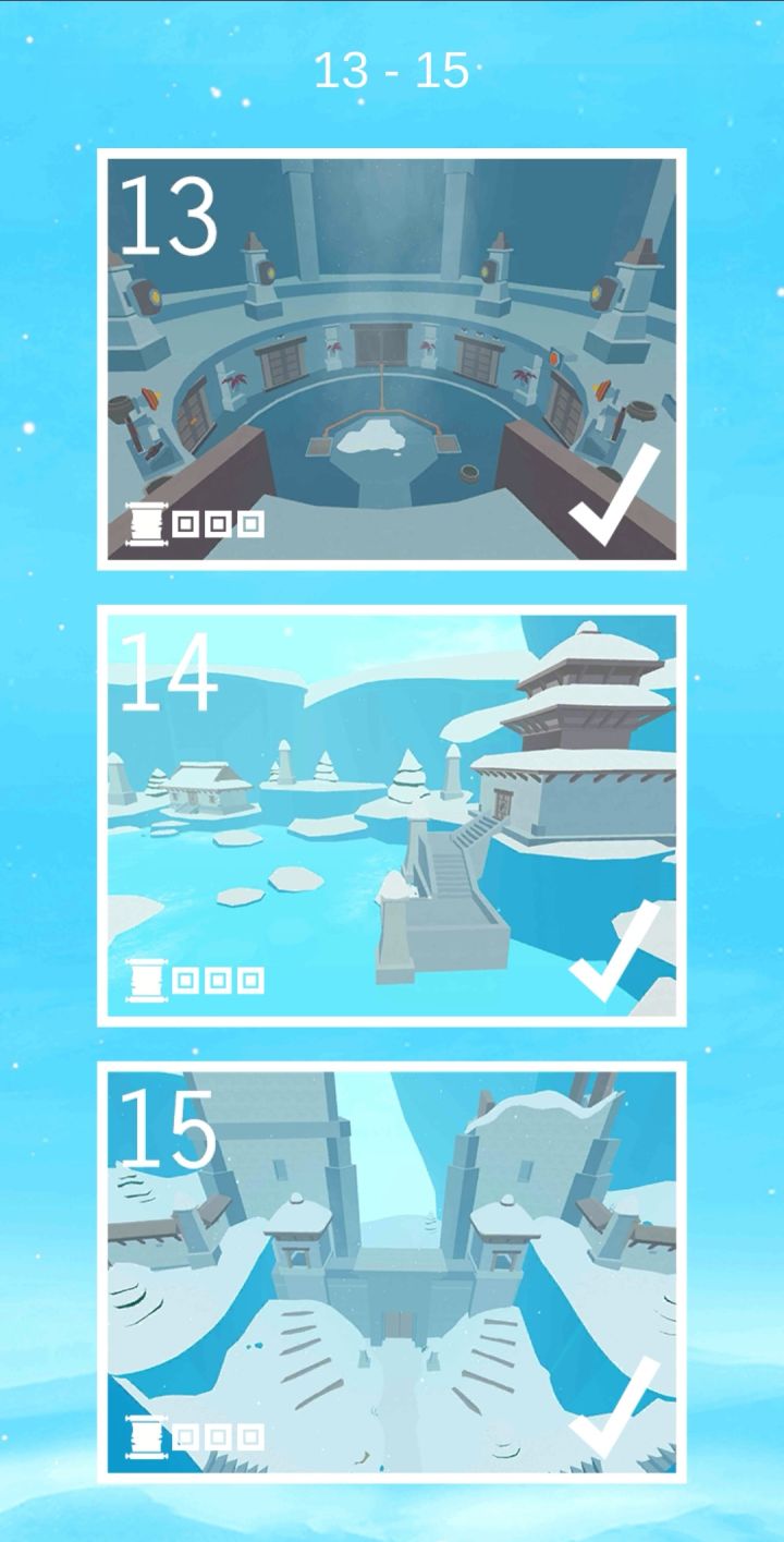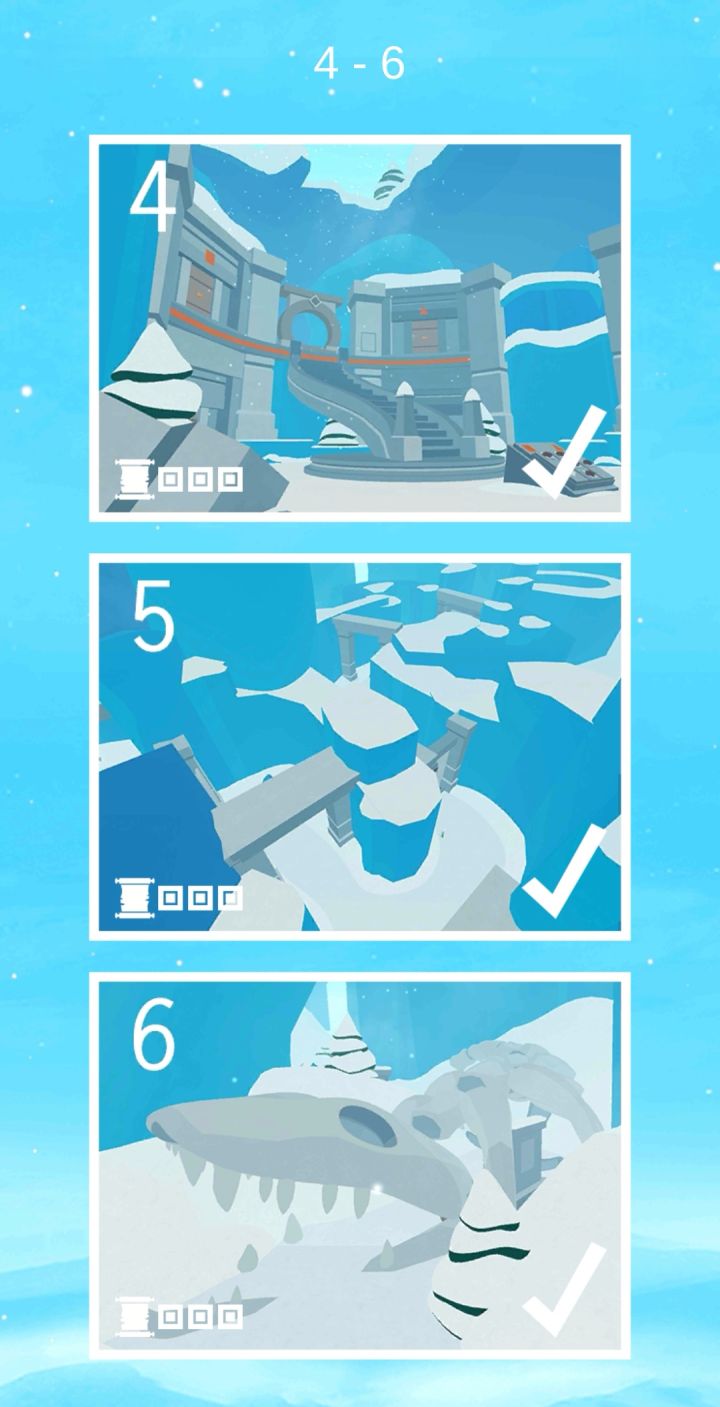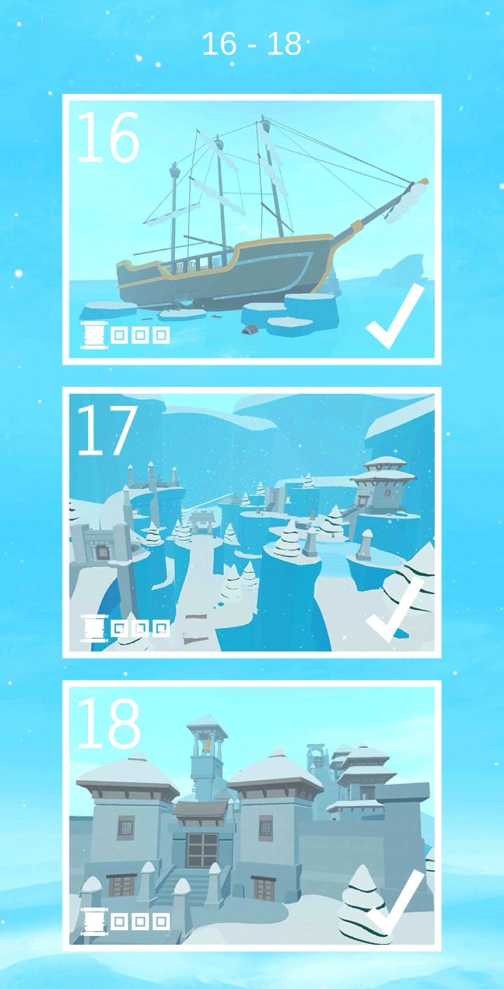 第三部也通关了,趁着周末有空边看电视边通关。玩家需要多番探寻,找到方形石板,将其放置于拱形门框上,以此激活门通关。这一部和之前两部一样,总共20关,但不同的是,第18关激活门之后有两个结局。这一部场景以冰雪世界为主题,场景独具特色,玩法也有创新,整体难度适当。但笔记仍旧还是比较难找,给出的线索理解和操作上比较困难。