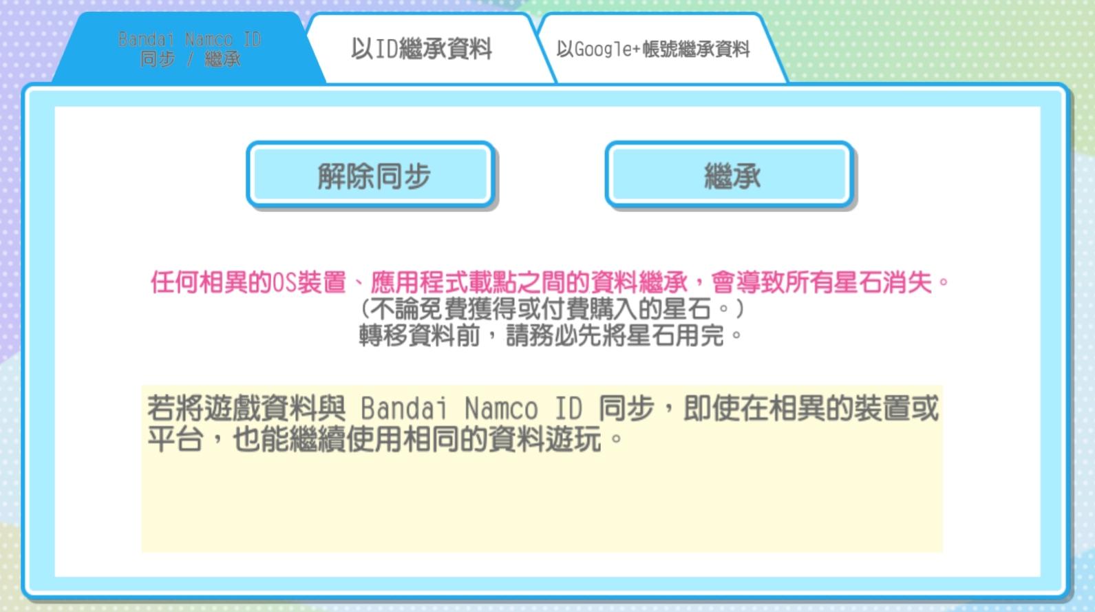 想问问有没有qoo下载爱娜娜游戏的朋友,搞了腕带的账号,然后同步到了日服或者台服游戏上,星石有没有清零呢(´-﹏-`;)有网友说在qoo下的繁中版是谷歌服可能会清零,但是游戏上说“能继续使用相同的资料游玩”是不是星石不会清零的意思 [p2] (我现在是搞了腕带的账号,想从繁中版 [p1] 换到日服或是台服 [是在同一个手机设备上换] 就怕星石没了)