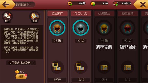 散兵游勇,不足道也。但不承想这逃兵,夷狄浪人,癲僧在乱世尽能拧成一团,在诸侯割据的夹缝中占得一席之地,也尽做些拦路截道,为祸一方的勾当,其势之大谈不上裂士封王,但各部纵横交错,层层叠叠,难以聚而歼之。将军大业初起,若能步步为营,各个击破,既可独善其身,又能造福一方。兵临城下是通过击杀士兵的数量计算收益的玩法。在每个难度中,击杀所有士兵和武将才算当前难度通关,并开启下一难度,并获得额外一次挑战次