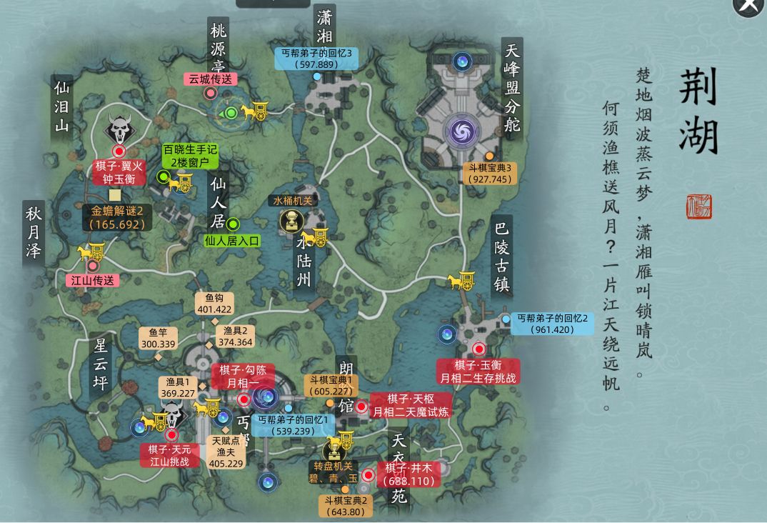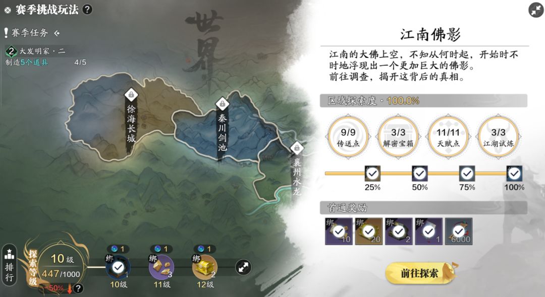 各位少侠大家好,我们又见面啦!江南佛影作为赛季挑战玩法的第一关,相信很多少侠进去之后都一头雾水,我应该先干什么?如何拿到首通奖励以及收集奖励?别急,别急,下面把收集到的点位全部都列出来。 一、核心玩法 挑战玩法最主要的核心就是,探索以及收集,第一关“江南佛影”中需要开启9个传送点、解密3个宝箱、拾趣11个天赋点以及完成3此江湖试炼任务,进入地图之后首先会出现的是3个主线探索任务,这个任务不会出现在