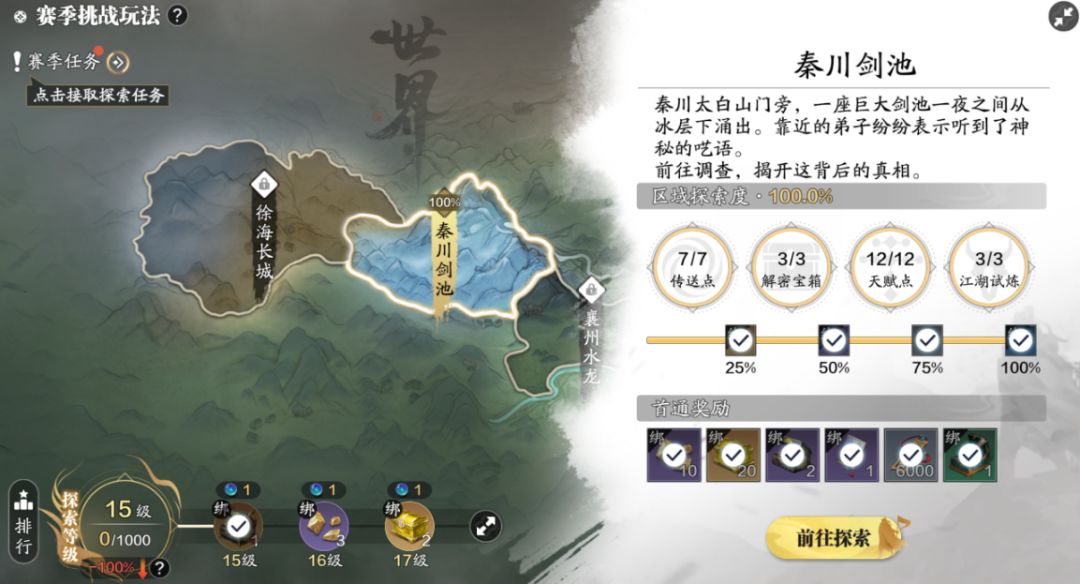 各位少侠大家好!我们又见面了,继上次的江南佛影之后,喜欢探索的少侠是不是感觉意犹未尽?这不,秦川剑池探索地图马上就来了,接下来我们一起看看秦川的探索的全攻略吧! 一、探索进度 此次的探索比较简单,我们需要7个传送点、3个解密宝箱、12个天赋点、3个江湖试炼即可完成100%的探索进度奖励,该地图的主线任务只有两个,地图较小还是挺好找的。 二、主线任务 (1)主线1:药王谷五行机关(687,396) 我