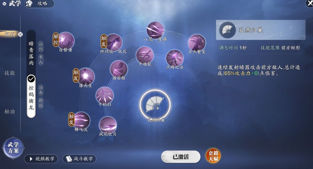 大家好,我是虎牙直播的白小纯。感谢潇潇邀请我做一期关于唐门论剑攻略及其日常玩法,本人在天涯测论剑中也是取得了独孤求败的段位,可能不算唐门顶尖高玩,但也对唐门有属于自己的一个理解。那么我们话不多说,直接进入正题。 要想玩好唐门,首先要了解他的pvp套路【暗青落雨】: 【风花饮月】:单体伤害技能,对目标总计发射三段暗器,每段有65%的概率触发【穿心翎】(ps:风花饮月对于浮空状态的目标可以触发浮空连击