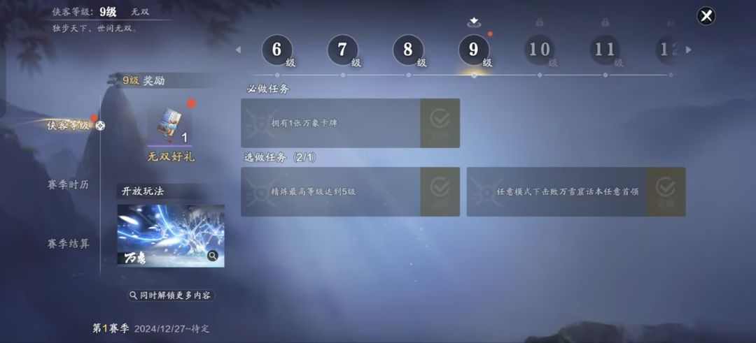 赛季版本第四天,侠客等级开放至9级,同步开启万象系统和万雪窟副本,还有装备分解系统。让我们一起来看下今日任务解读及购买资源推荐。 侠客等级:9级 必做任务:拥有1张万象卡牌 获取路径:月漩珠商店、赛季令商店、闲情令商店、剧情商店、周活跃礼包、探索等级奖励、360月灵石兑换、碎叶兑换、侠客等级奖励、玉京三界通过奖励、都可以获得。 搭配建议:万象总共分为副本/论剑/战场三个大类,建议创建3个不同的方案