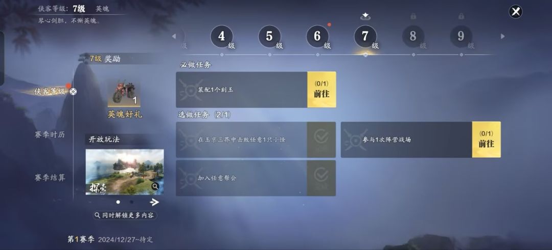 赛季服的等级提升体系做了全新的调整,通过每天完成侠客等级任务来提升等级,今天是开服的第二天可以升到8级,让我们来看一下等级任务指南及必做任务清单。 侠客等级:7级 必做任务:装配一个1刻玉 任务指引: 首先需要完成刻玉鉴定,只有把增益和减益全部鉴定完的璞玉才能穿戴使用,每次鉴定需要消耗昆仑镜。首次鉴定拥有上限75%鉴定成功加星几率,若鉴定成功则下次的成功几率为65%,以此类推。每次-10%。若鉴定