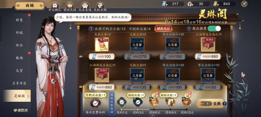飞升服开服到现在我们绑定点券的消费重心也要发生变化,今天和大家推荐一下当前版本的绑定点券消费指南,各位少侠可以参考哦。 灵琳阁 推荐指数:★★★★★ 当前少侠们最主要的功力提升材料灵琳阁基本上都有售卖,无论是188琅纹还是焕生自选宝箱,都可以帮助0氪少侠提升功力。结合灵琳阁每周2个神兵自选礼盒,还有帮贡兑换等,一周12个购买需求建议买完。接下来说一下商城其他渠道值得购买的道具。 神侠招募令 推荐指