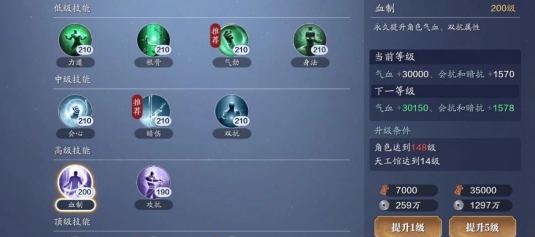 各位飞升服的少侠们好呀,当前服务器已经开放143级。本阶段体功力提升较少,全部拉满提升区间在1000左右,让我们来看下提升细节。 经武弘文功力提升:419 143级开启高级技能血制190-200级,需要消耗7万帮贡和2590万碎银,带来248点功力提升;顶级技能四维开放至190级,需要4.1万帮贡,带来51点功力提升; 特殊技能破伤、御伤各开放2级,不提升功力;穿透、抵抗各开放2级,带来120点功