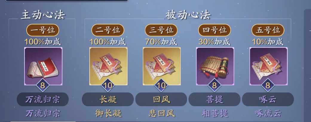 近期有很多回归少侠想要追赶一波功力,那么在当前版本下该如何提升呢?本期,我们一起来看一下当前的功力及格线14.9W的组成细节。 心法组成 心法分别是8级万流归宗+10级御长凝+10级悲回风+8级相菩提+8级啄流云。目前御长凝已经满级,悲回风10级还未点满,还有提升空间。主动心法拂心火已经做出来了,目前已经点到5级,后面点到7级可以代替万流。 气海 气海为2级气海,天0级+地15级+人24级。气海3