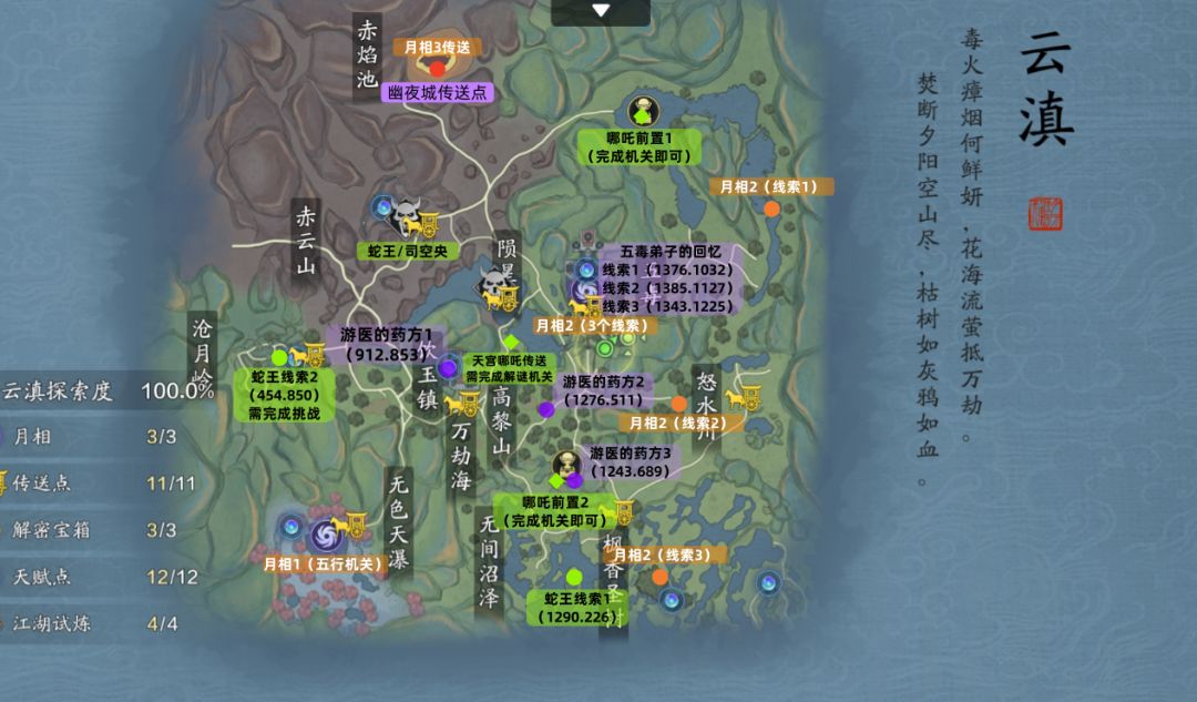 各位少侠大家好!好久不见,随着S2赛季的开启,探索玩法也迎来了新的地图。那么本期的攻略我们就来说一下“云滇花桥”的探索全攻略吧! 一、探索优化 与S1赛季的探索有所不同,新赛季的探索加入了探索手册辅助机制,少侠点开后可以看见该地图探索的所有任务以及线索。 包含了天赋点位置、解谜宝箱位置、探索宝箱位置等,还有首领挑战中的任务流程,隐藏线索等。少侠再也不用满地图乱跑去寻找线索啦! 但这里需要注意的是: