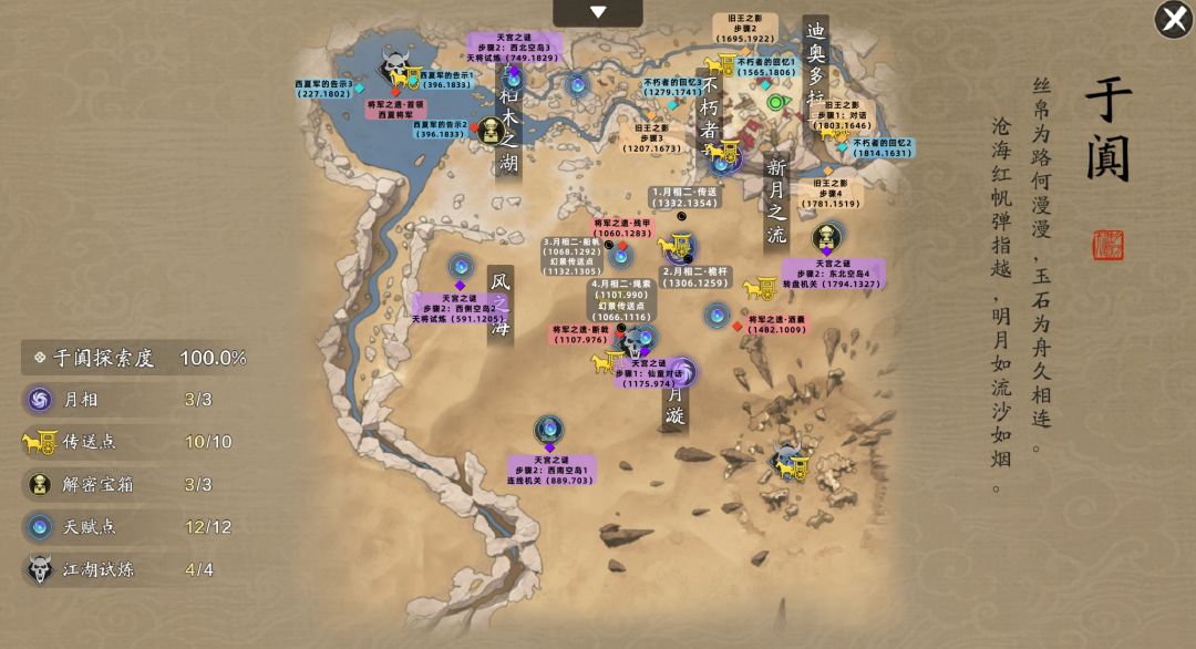 各位少侠大家好,我们又见面了。随着新赛季的玩法的陆续开启,最后一个探索地图于阗沙海也迎来了少侠的挑战,本期探索十分的简单,只是首领略微难打,接下来我们一起看看吧! 一、主线任务 ● 月相一:五行机关 进入地图后直接与旁边的孔清瑟对话,接着自动寻路到达不朽者驻地区域,注意门口的滚石机关,少侠到达位置后可以从左边绕过去,接着寻找散落的五行柱就可以了。 (1)五行柱·火(1472.1645) (2)五行