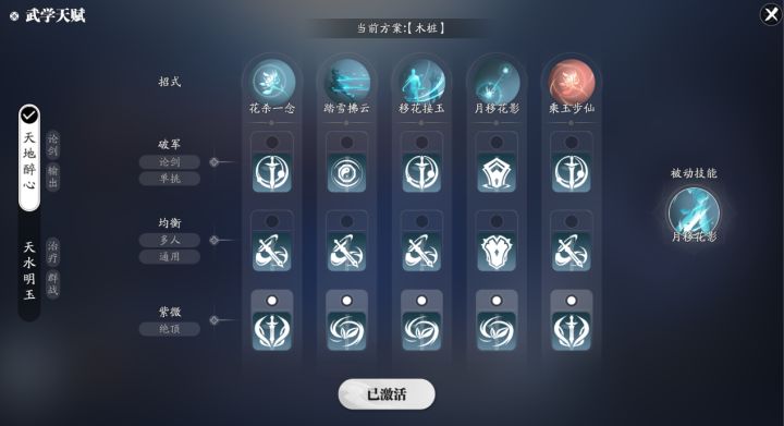 各位少侠大家好,我们又见面了。上一期我们说了太白的木桩连招教学,不知道少侠学了之后有没有加以练习?本期我们来说说赛季服移花的木桩输出教学。一、技能天赋选择移花由于是奶妈和输出双修职业,所以输出方案只有一套:这里推荐带论剑套路中天赋全部为紫薇绝顶的方案。二、刻玉选择刻玉选择我们还是老样子,把琢雅,莹煌,振珩,重环四个技能补到满级即可。三、卡牌技能搭配卡牌也是不变,在建安风骨凑齐的情况下我