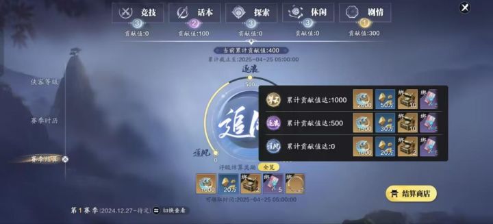 当前赛季版已经进入到了季中结算的阶段,开启了结算商店-季中结算,各类商品中除了曜石甲子和绝品璞玉匣以外,折扣道具都推荐购买。尤其是追求功力的PVP少侠,一定不要错过。赛季结算各玩法提升贡献值达到攀云即可直接领取月灵石*2000、神品璞玉宝匣*10、万象盈虚永恒*5、万象·朔望生灭、天涯之内头像框、天涯彼端名片、赴天涯图标;评级达到逐浪即可领取月灵石*1500、神品璞玉宝匣*10、万象盈虚永恒