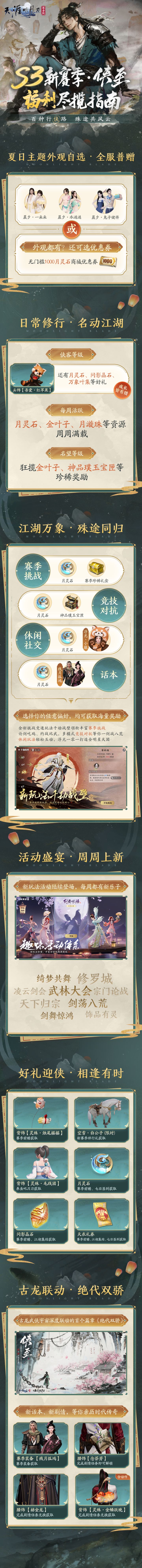 滴答,滴答!少侠,你的S3江湖速递已到,请火速签收~作为天刀赛季版首个赛年最重磅的更新,《侠至》赛季不仅致力于为少侠们带来更紧凑的赛季节奏、更畅快的江湖体验与更丰富的硬核内容!更同步推出诚意满满的新赛季启程福利助力少侠畅行新江湖,精美外观免费领、成长资源人人有、还有S3突破新服【绝代双骄】专属好礼等多维度的福利体系,诚邀少侠加入,共游新赛季!免费外观人人都有S3赛季新赛季为少侠们献上外观好