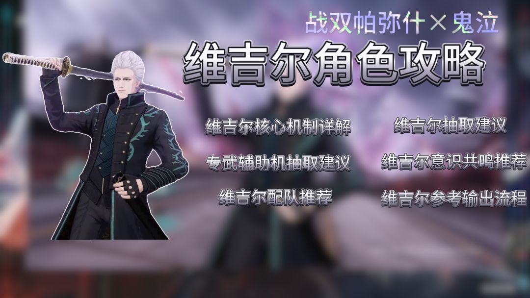 内容提要 一 角色解析 二 适用环境分析 三 专武/辅助机建议 四 升阶 五 总结 本文将介绍维吉尔的基本情况和实际用途,为大家提供该角色的抽取建议,后续或随着角色深入开发,得出最新结论可能会与本篇内容在细节上存在偏差,请注意文章观点的时效性。 一 、角色解析 (1)角色介绍: 维吉尔,鬼泣中的人气角色,次元斩的代言人,在鬼泣联动版本《幻寂鸣泣曲》中登场,维吉尔的阎魔刀、魅影刃、贝奥武夫等,都
