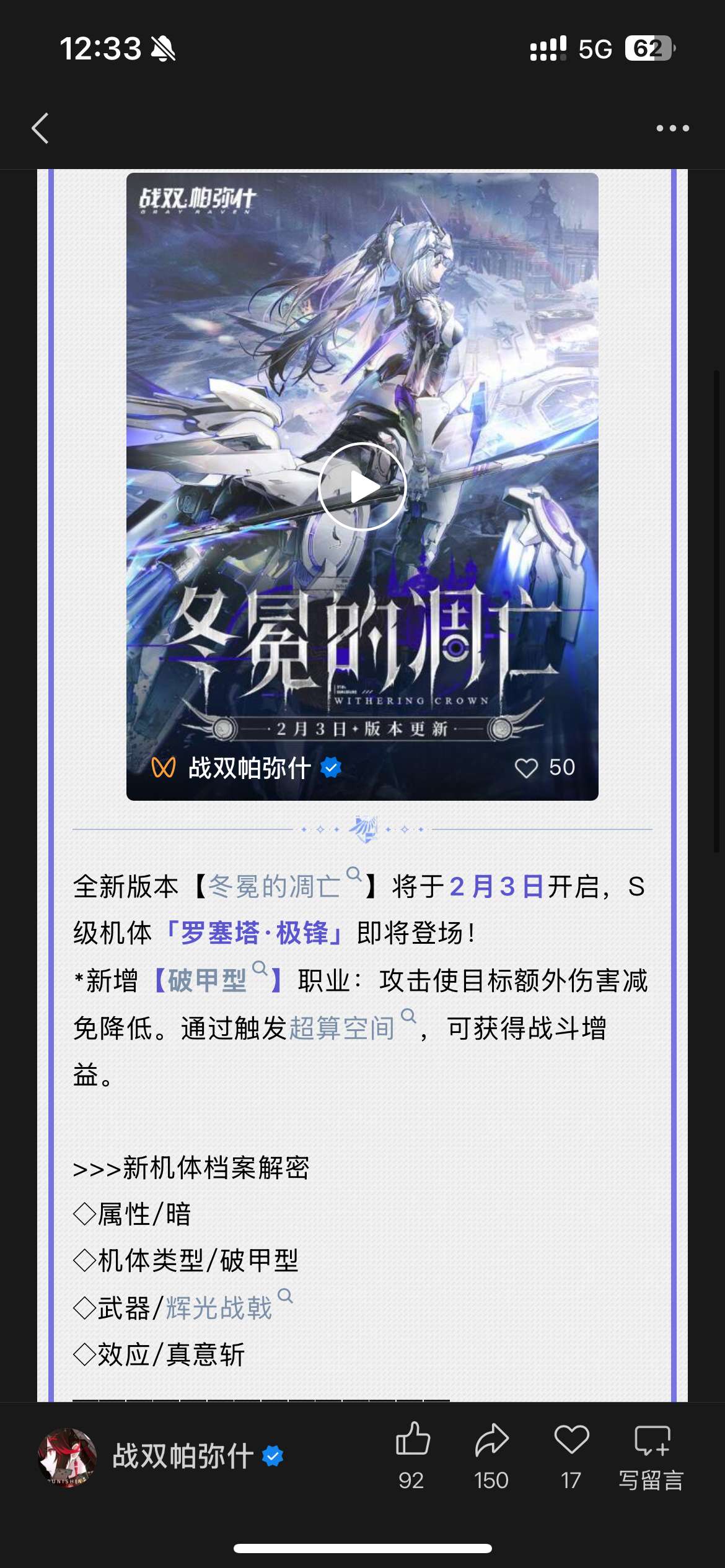 马上就要到战双的新春版本啦。不出意料的,这个版本的布偶熊是冰增幅可肝s。那么马年一定是我们的罗塞塔新机体登场。新版本的测试服在23号就招募了。没想到这么快。才想起来的时候就已经晚了。好了,废话少说,步入正题。来猜一下罗塞塔属性:按在岗时序排:第一位肯定是暗装甲。卡列在岗时间真的非常长了,可以说大部分情况都用小梅代替了。现在出一个暗装甲已经可以说是不稀奇了。主c方面:目前可能也就