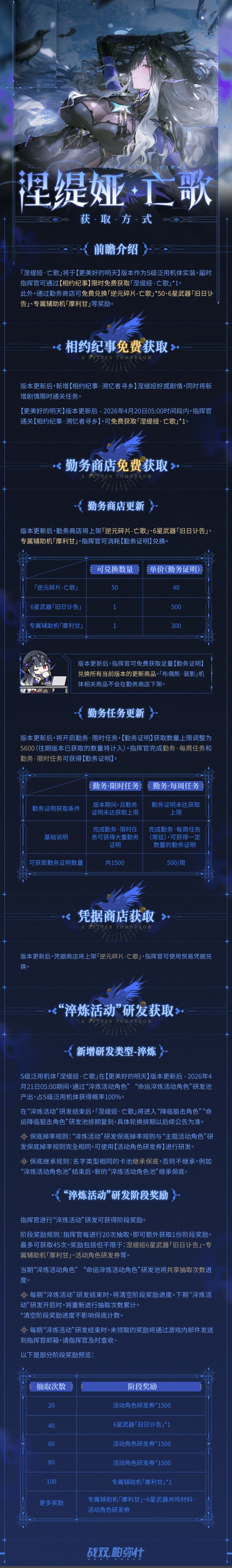 「涅缇娅·亡歌」将于【更美好的明天】版本更新后上线,届时指挥官可通过【相约纪事】限时免费获取「涅缇娅·亡歌」*1,通过勤务商店可免费兑换「逆元碎片-亡歌」*50、6星武器「旧日讣告」、专属辅助机「摩利甘」等奖励。※更多角色获取方式,指挥官可点击长图进行查看。
