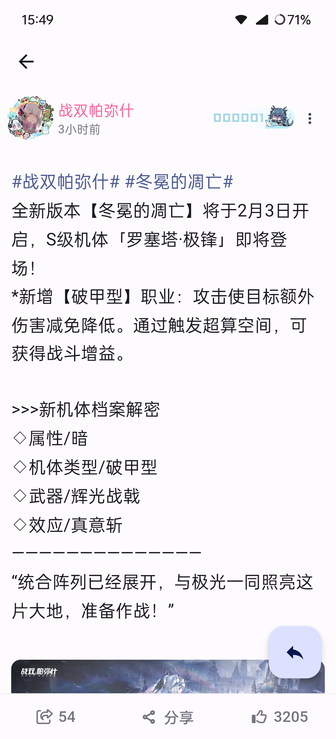 全新版本【冬冕的凋亡】将于2月3日开启,S级机体「罗塞塔·极锋」即将登场!*新增【破甲型】职业:攻击使目标额外伤害减免降低。通过触发超算空间,可获得战斗增益。>>>新机体档案解密◇属性/暗◇机体类型/破甲型◇武器/辉光战戟◇效应/真意斩——————————————“统合阵列已经展开,与极光一同照亮这片大地,准备作战!”