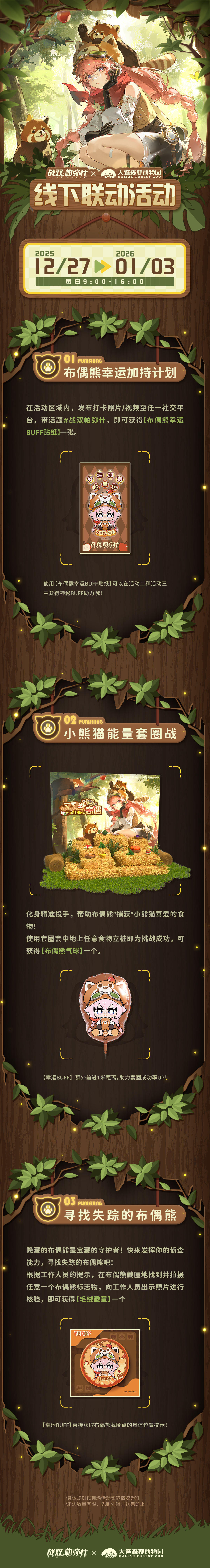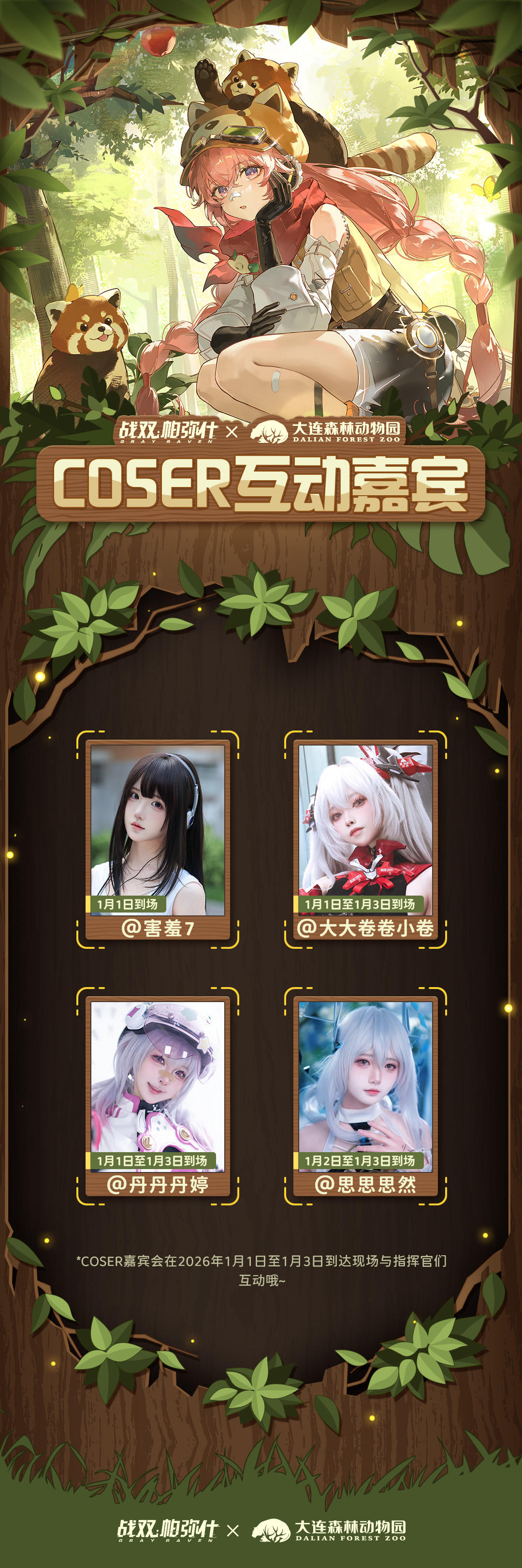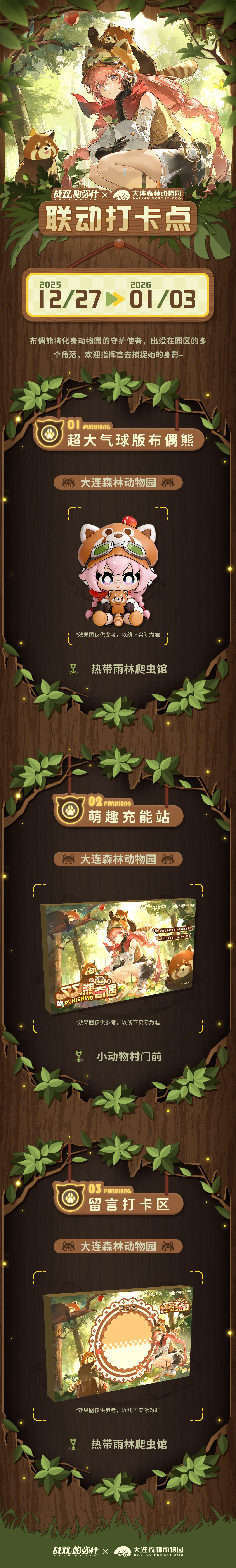 出发,“又又”熊奇遇!战双帕弥什×大连森林动物园联动活动情报公开! 【联动时间】12月27日-1月3日 【活动地点】大连森林动物园南门 【联动活动前瞻】♦战双帕弥什×大连森林动物园 线下快闪活动即将开始,趣味主题活动、COSER互动等内容欢迎指挥官前往体验。♦小熊猫守护企划启动,认养小熊猫“又又”,守护它的成长之路♦线上公益周边贩售已开启,本次周边贩售所得将捐献给大连森林动物园,用于园