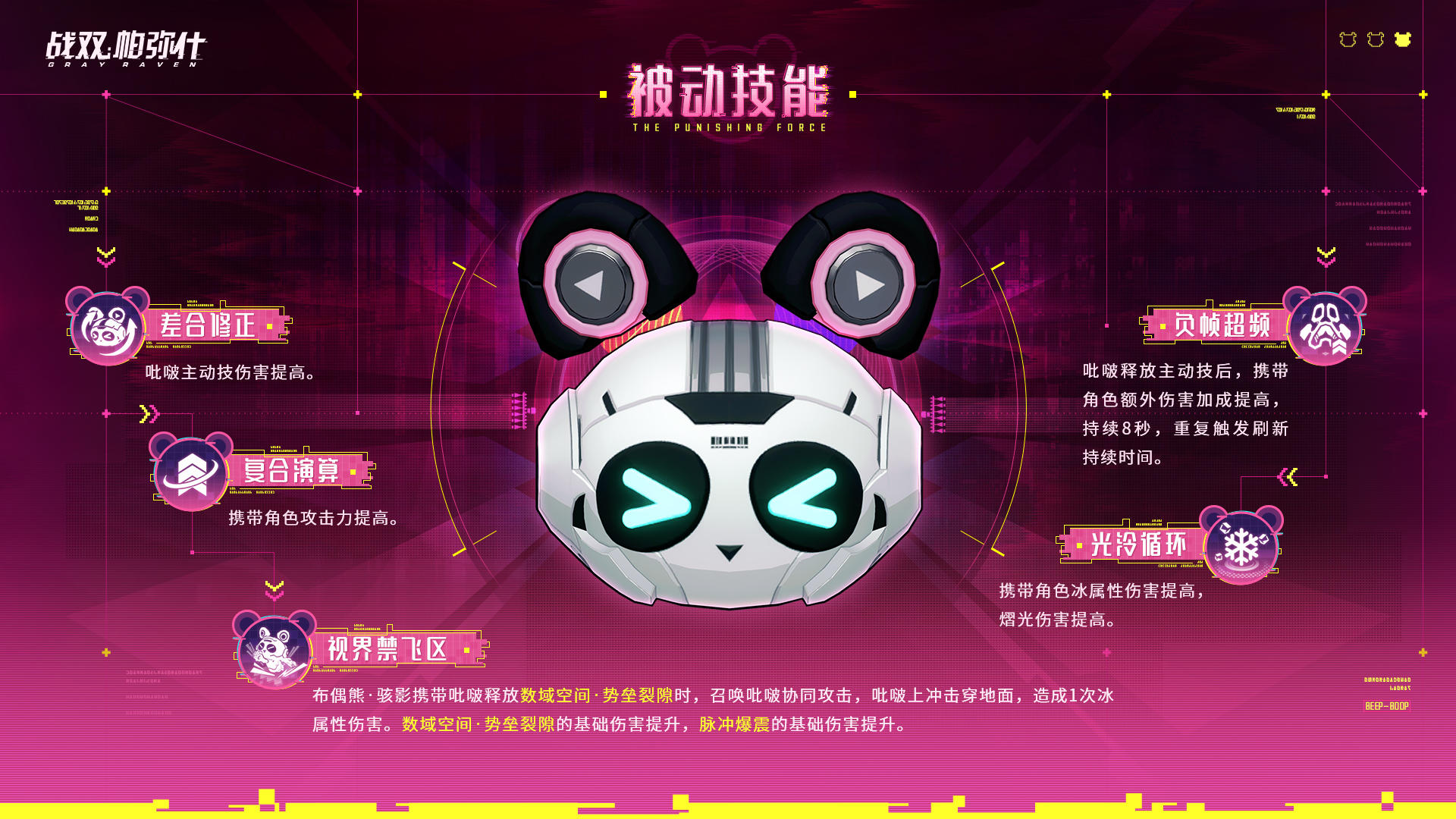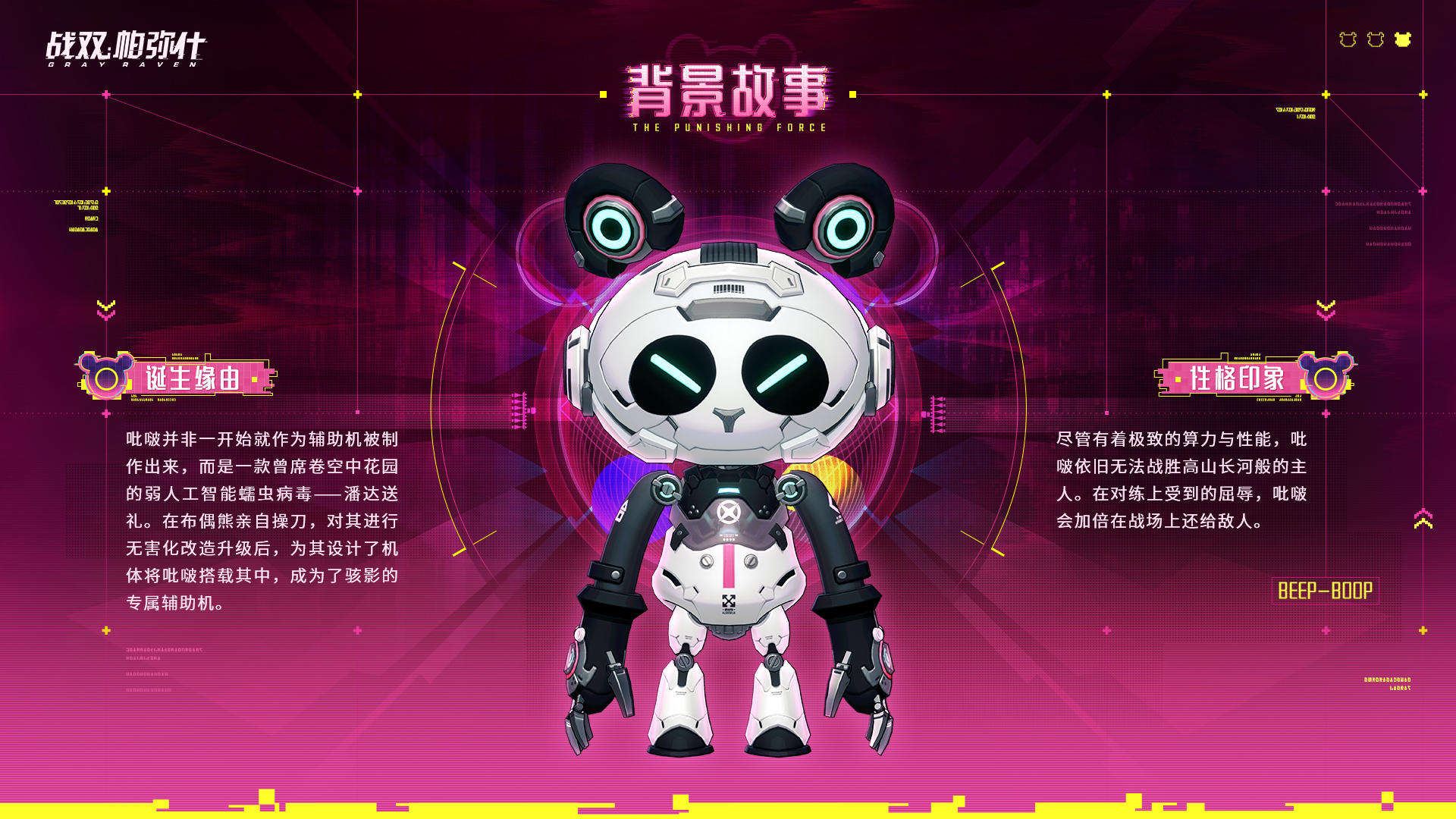 战术连接进程开始>>> S级辅助机「吡啵」情报公开! 吡啵特长为电子战,在入侵和反入侵上有着卓越的表现,深受工程部队信任;由于应用场景不广,一度被当作移动音箱,在吡啵自己的要求下,加装了战斗模块。 ————————————— *本素材仅作展示,非最终效果,具体请以正式服实际情况为准。#战双帕弥什 #推想视限
