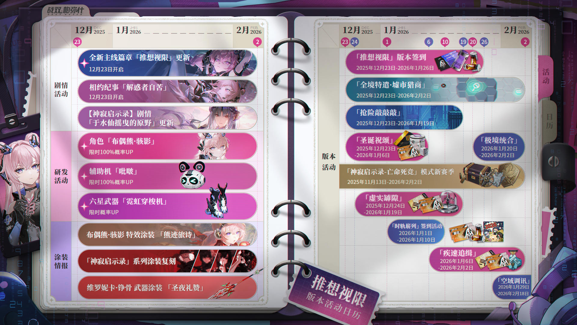 叮咚~您有一份「推想视限」版本内容资讯,请查收!12月23日「推想视限」版本即将开启:在「抢险敲敲敲」中,化身代码高手;于「虚实罅隙」中,不断挑战;齐心协力,共闯「全境特遣-墟市猎商」……*更多活动详情,指挥官可点击下方图片查看~