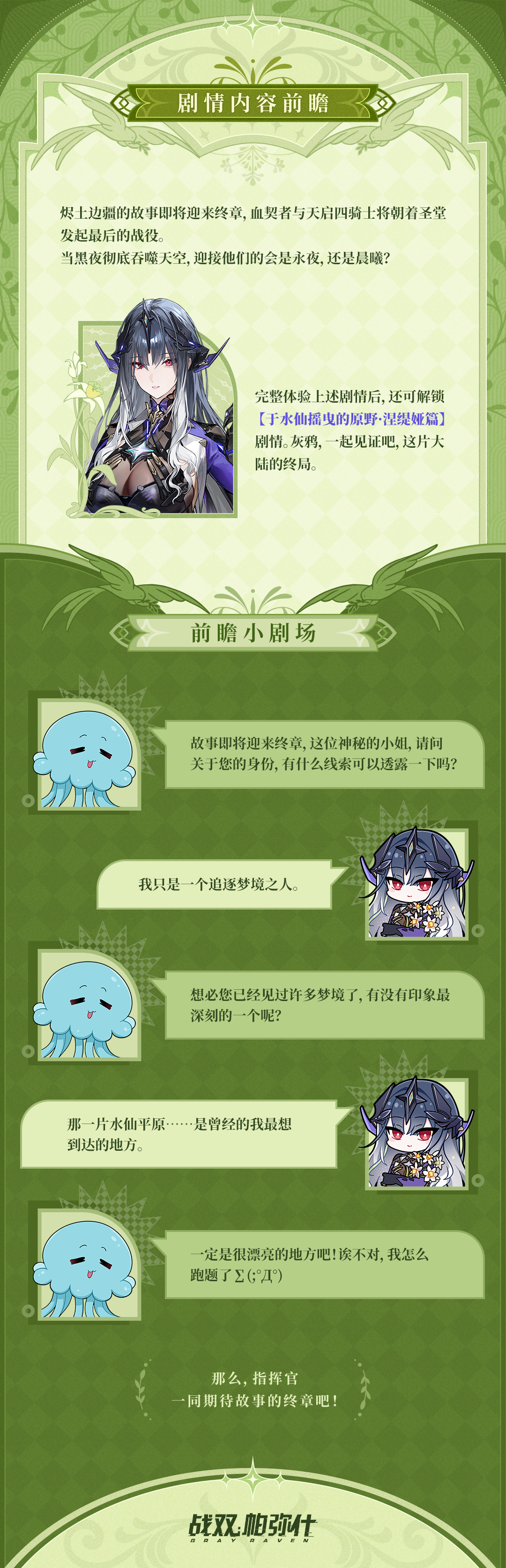 指挥官通过【神寂启示录】-【启示之路】完整体验渡边、薇拉、万事与莉莉丝四位骑士的剧情后,即可解锁【神寂启示录】终章&涅缇娅角色剧情。 【更新时间】12月23日版本更新后 【等级要求】40级及以上的指挥官 【活动奖励】本次兑换商店新增【常驻商店Ⅳ】,指挥官完成「启示之路」模式探索、完成任务获得[玛门铂金币],可在【常驻商店Ⅳ】兑换[活动角色研发券][涂装设计图][武器涂装设计图][表情-送花花