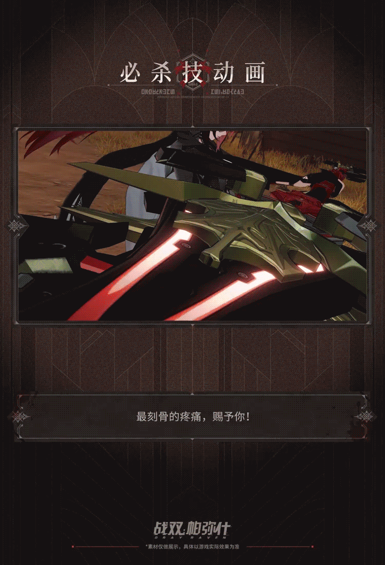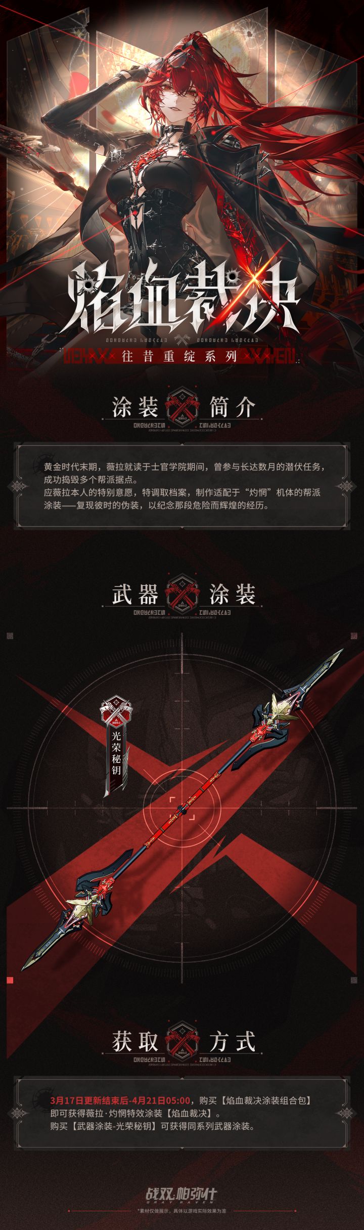 黄金时代末期,薇拉就读于士官学院期间,曾参与长达数月的潜伏任务,成功捣毁多个帮派据点。应薇拉本人的特别意愿,特调取档案,制作适配于“灼惘”机体的涂装——复现彼时的伪装,以纪念那段危险而辉煌的经历。★获取方式★3月17日更新结束后-4月21日05:00,购买【焰血裁决涂装组合包】即可获得薇拉·灼惘特效涂装【焰血裁决】。购买【武器涂装-光荣秘钥】可获得同系列武器涂装。 *本素材仅做展示,非最终