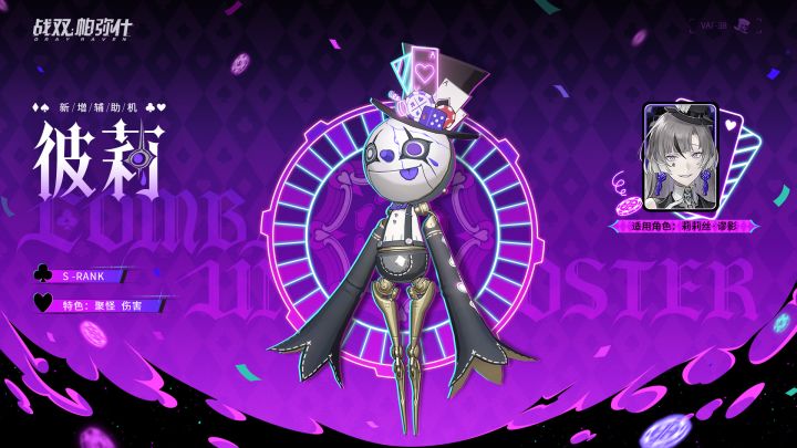 彼莉的数据库中保存着囊括古今的多种游戏规则,堪称这方面“行走的博物馆”。“我可以在各种情况下提出最适合的游戏内容,也能提供各种所需要的道具,当然,当然,我也保证他们绝对刺激!”——彼莉的自我介绍S级辅助机「彼莉」情报公开!—————————————*本素材仅作展示,非最终效果,具体请以正式服实际情况为准。