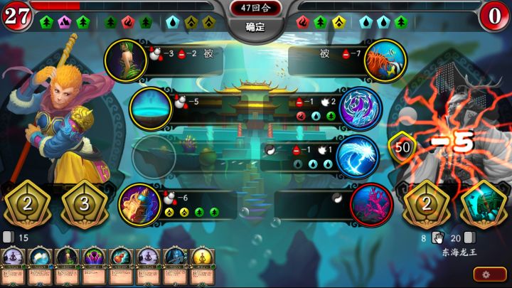 来到这个游戏这么开始体验呢?慢慢看,这个游戏要用心感受的。我们先从游戏界面看起:游戏界面简单明确,我们在看下这个游戏的核心部分:游戏中我们可以看到4个放技能卡的地方。每一个回合就只要上一牌技能卡但条件够了可以额外上技能。每一个技能卡会有自己的效果,而有的技能卡需要灵文才能触发:看图,这个技能卡需要金木木土,我们灵文同样才能发动效果。顺便说下每一个回合灵文可以选择3个,灵文不合适可以点选择