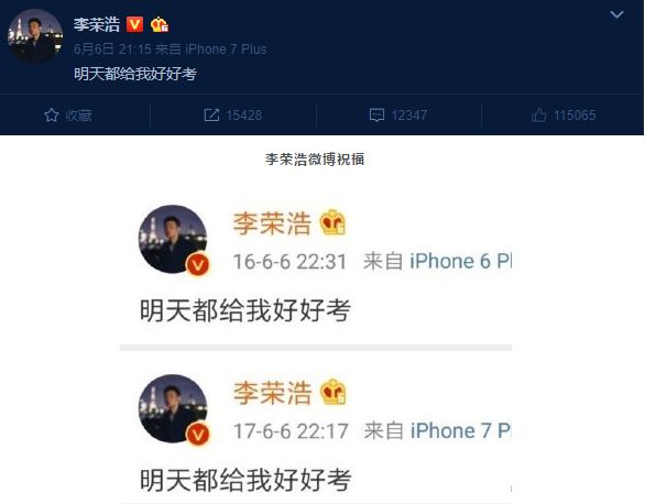 据统计,今年共有975万高考生奔赴人生考场!创下近8年来报考人数历史新高,他们中绝大多数是2000年出生的千禧宝宝。为了给高考考生加油,大家都想出了各种方式。浩哥丢出来他千年不变的文案:明天都给我.....可爱帅气的王源在拍戏片场,也不忘要为易烊千玺手写祝福:高考加油666!足以见得,高考的重要性!各个学校、老师、家长都做过花样众多的加油呐喊方式当然,高考第一天,属于《宫心计2深宫