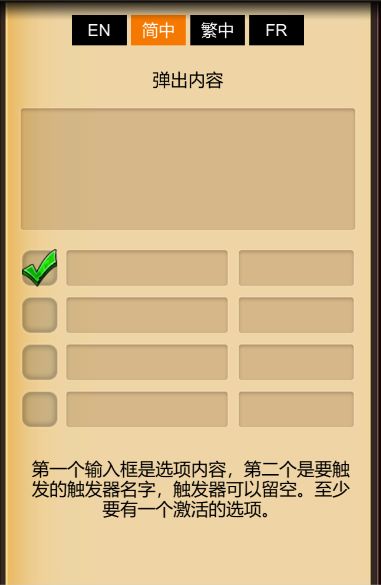 改了不少东西,加了条件和效果的关联,一些新的效果和触发器报错功能(仅限触发器,技能类的卡死还不行) 触发器关联效果: 触发器效果现在可以和条件联动,读取触发条件中的单位,单位类型,位置和颜色,比如使用单位死亡条件,效果使用生成单位,然后把需要的关联勾上之后,就可以实现类似原地复活,原地生成某个特殊单位等等。 新增触发效果-弹框选项,这个可以不用用格子来做选项让玩家选择了,可以直接给弹框,让玩家选择