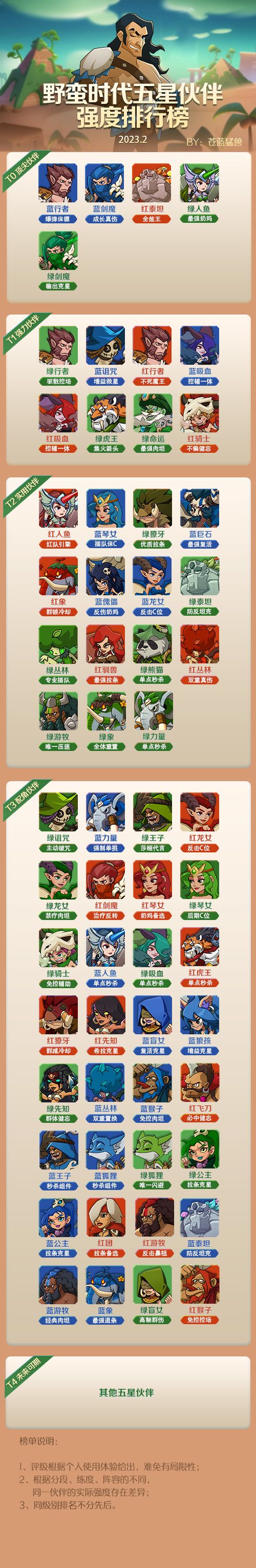 【首领分享会 | 野蛮时代五星伙伴强度排行榜来袭!】亲爱的首领大人安~今天小妹为首领大人们带来一份“新礼物”。这个礼物属于是小妹借花献佛了💐昨日听闻大佬“苍蓝猛兽”沉寂许久终于放出最新一期五星伙伴强度排行榜啦~今日大佬找到小妹投稿,说想给更多首领大人们看看。那就一起往下看看这份榜单吧~注:玩家榜单非官方建议,仅供参考哦!首领大人们有任何不同的看法和建议,欢迎在评论区留言指出~