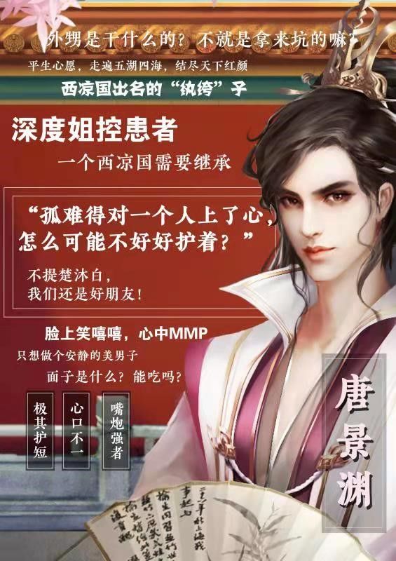 【人物风华录】第一卷-真假浪荡子·唐景渊·真情时刻西凉国太子,婉妃唐婉之的嫡亲弟弟。平生最大的心愿是,当一名子弟,逍遥快活,风流人间。奈何出生帝王家,又是唯一的皇储,唐景渊从生来时,就有自己的使命。唐婉之为护西凉国安稳,自愿和亲到凤歌,一直是唐景渊心中的一根刺。他佩服慕流年的治国才略,却又担心慕流年有朝一日野心太大,会影响到西凉国。所以,他必须要未雨绸缪……世人皆说他放荡不羁,绝不会