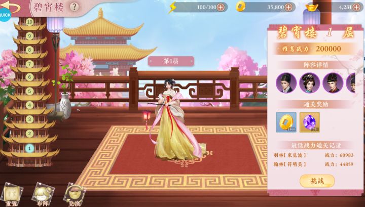 《梦回凤歌》测试在即,玩法抢先看之碧霄楼~开启要求:等级达到30级开启时间:全天开放碧霄楼奖励:经验和龙凤币小主在主界面点击“碧霄楼”即可进入碧霄楼界面,初始位置是一层。点击挑战即可开始体验碧霄楼玩法,战斗胜利后可获得龙凤币,使用龙凤币可兑换装备。