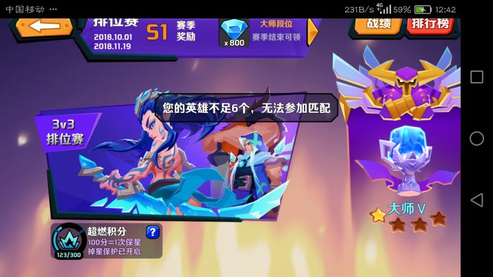 目前大师,卡在这里的原因是,没有英雄,没有英雄,也没钱,本来想冲刺下排行,_(:з」∠)_为什么?为什么?