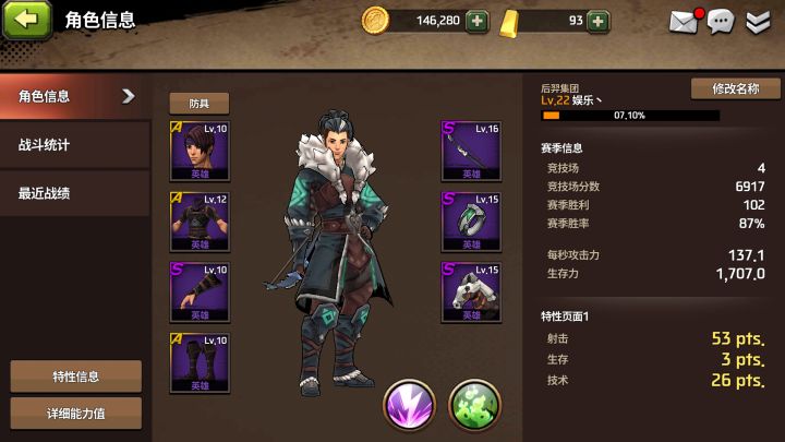 不知道什么成就送了个武器材料箱,赶紧把武器升到紫色,本来考虑是升短弓,结果还是升了石弩,效果不错,一口气16连,17的时候失误一下,被终结。。不过隔了两把又遇到他,我也把他16连终结。。一定是确认过眼神。。。