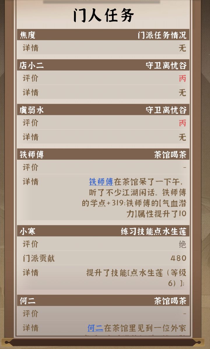 玩了七年就给19点传承点 外门弟子就是攻城时没有战斗场景,门派建设稀里哗啦,委任人减信赖值,例如门派设施委任,远行等,打架输多赢少 还有啥名词啥的,整的杂又繁,字体看着就不舒服 每月月报 弟子就是摆设有啥用 割裂玩啥,,,没有啥随机事件,总体来说不想说了门人邀请必须通过剧情获得 远行 探索的区域再进入不用探索了,没有随机事件 都是固定,玩着就是卡卡卡