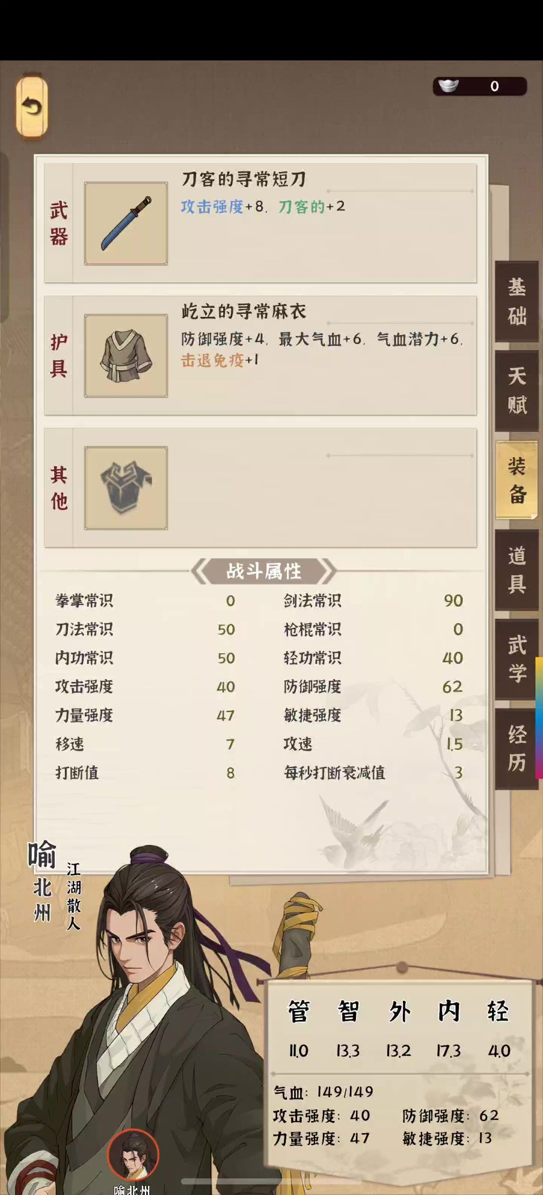 调整属性点,智慧高于其他,内劲次之,其余在8~12即可,管理5~8也别太低天赋推荐聚齐+武学奇才,其余任意携带物这里可以全刷高等级食物,也可以留一条鱼给香客和一个肉(门派第二个月远行需要喂狗拿武功的)————进入游戏从宅院出来先除了陆护院外的每个人都点一遍。然后存档到1再刷陆护院武功,尽量要标记的,然后再存档到1(下面就都是2号档,1号档别动,0号是自动档不用管,3号是有分歧时备用的)