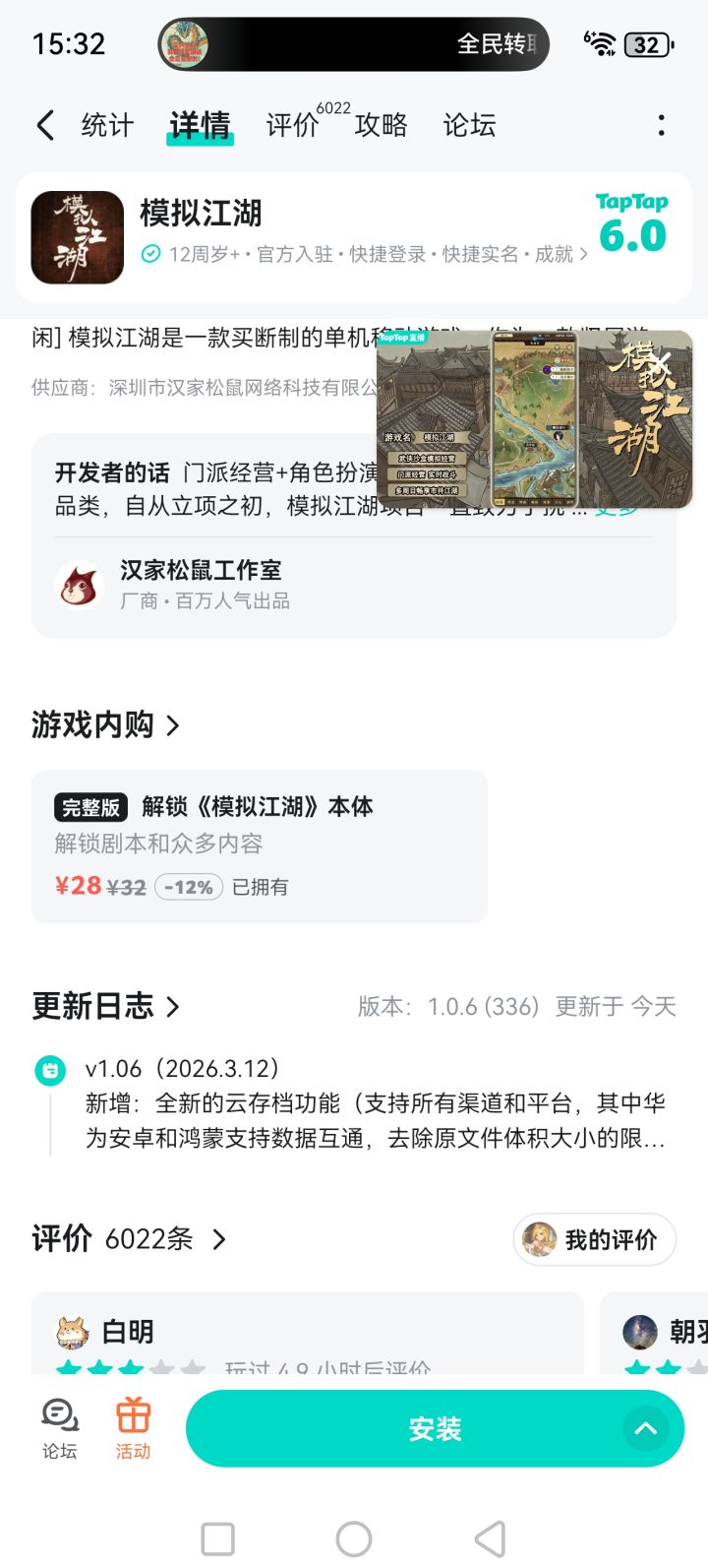 各位大侠久等啦!由汉家松鼠工作室研发的 《模拟江湖》 今日正式在 TapTap 平台首发上线!从最初的想法萌芽,到如今完整的江湖世界,感谢每一位关注、支持、期待我们的玩家。为庆祝这一重要时刻,我们特别准备了首发上线福利活动,在此帖下留言评论即有机会赢取丰厚好礼!❥ 活动时间即日起 — 2026年3月23日 09:59❥ 参与方式在本帖评论区留下你对《模拟江湖》的期待、祝福或想说的话,